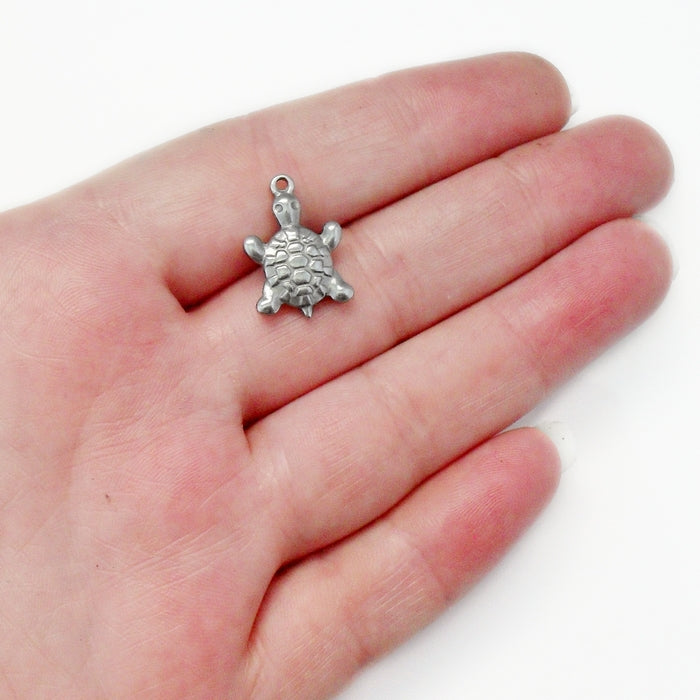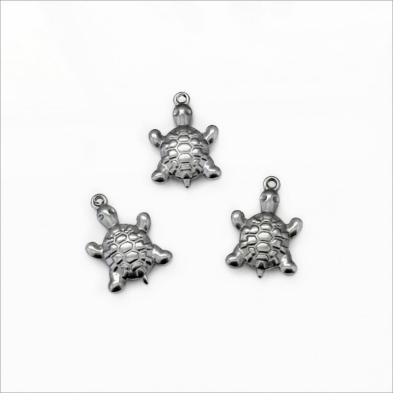 5 solid, cast stainless steel turtle charms, dark silver-grey in tone with a smooth, semi-polished finish - as solid steel, these are heavier than the average metal charm of similar size.