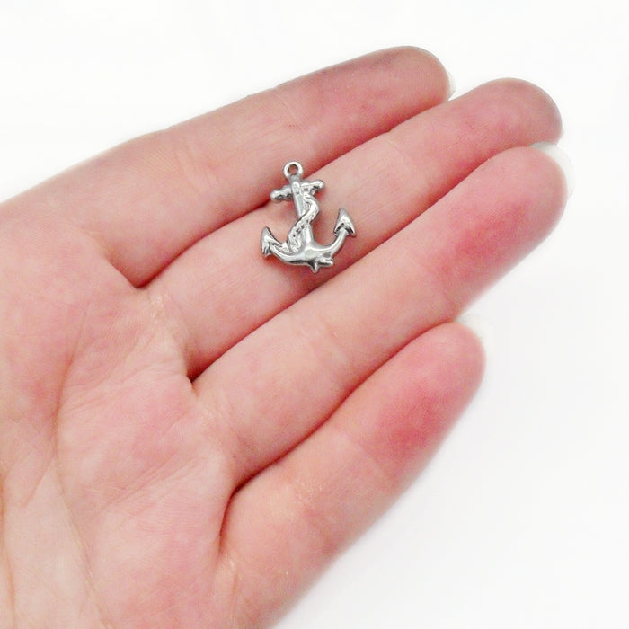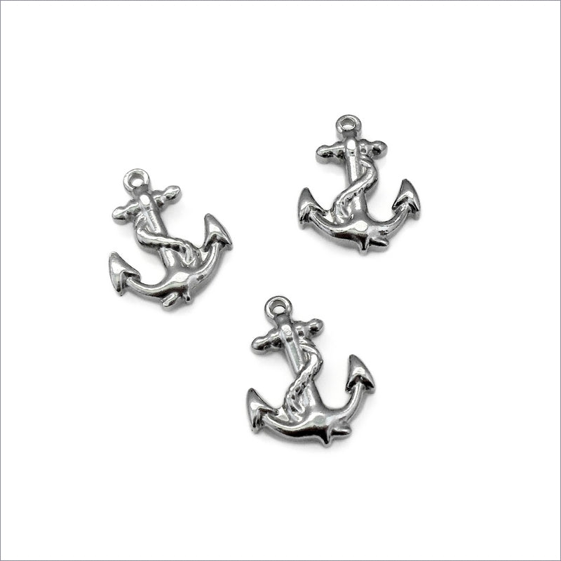 Five stainless steel anchor charms, solid and double-sided, with a semi-polished dark silver tone.