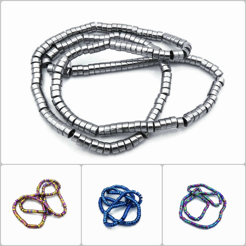 50 synthetic hematite spacer beads, in a uniform disc shape, available in a range of metallic colours (please note these colours are on the outside of the beads, while the inside surface remains silver-grey, as shown in the images).